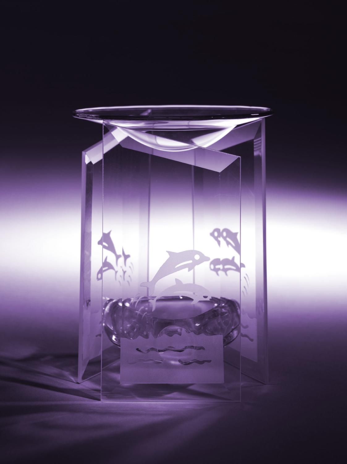 Delfiner är alltid lika fina och populära. På denna vackra aromalampa i facettslipad glas förmedlar delfinerna en sprudlande energi, som du dessutom kan höja med doften av några utvalda eteriska oljor som citrus, Rosmarin eller Happy days.